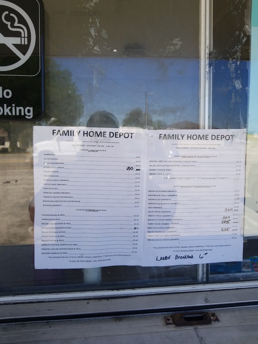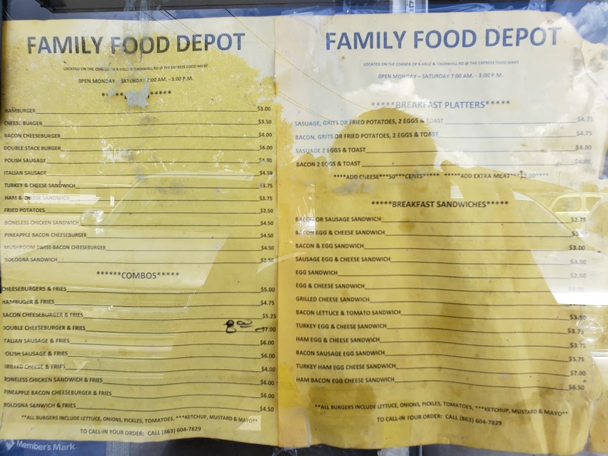 The menu at Family Food Depot offers a hearty selection that caters to various tastes, with a focus on satisfying comfort food. For lunch, patrons can choose from a range of burgers such as the Hamburger, Cheese Burger, Bacon Cheeseburger, and the Double Stack Burger, each promising a delicious and filling meal. For something a bit different, there's also the Polish Sausage. If you're looking to pair your sandwich with something extra, the Combos are perfect, offering combinations like the Cheeseburger & Fries, Hamburger & Fries, and the Double Cheeseburger & Fries, along with other options like the Italian Sausage & Fries. For breakfast lovers, the restaurant serves platters that include choices like Sausage, Grits or Fried Potatoes, and 2 Eggs & Toast, along with variations featuring Bacon or Sausage paired with eggs and toast. The Breakfast Sandwiches menu is equally tempting, offering a variety of tasty options, including the Bacon or Sausage Sandwich, Bacon, Egg & Cheese Sandwich, and the classic Egg Sandwich. Whether you're in the mood for a substantial breakfast or a quick lunch, Family Food Depot’s menu has something to satisfy every craving.